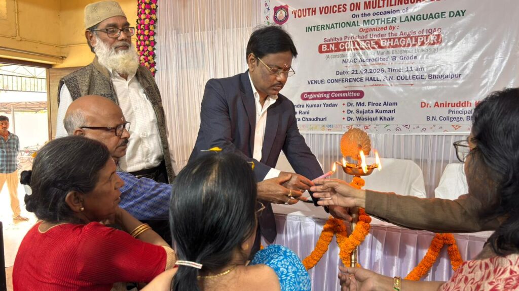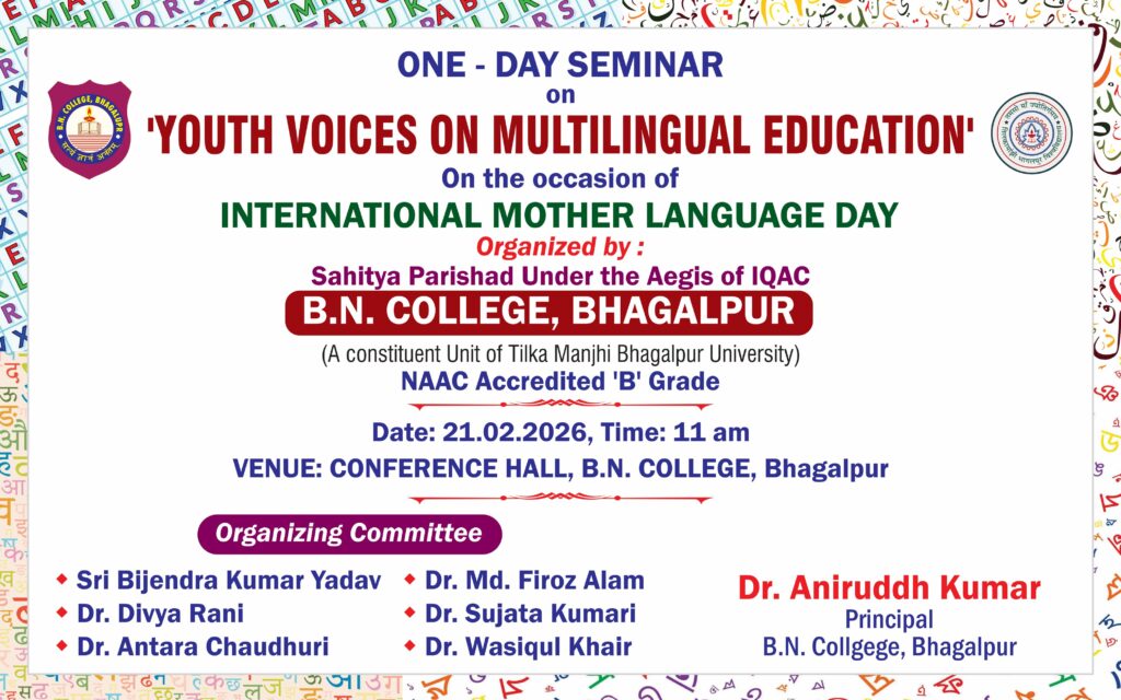 महाविद्यालय साहित्य परिषद् एवं IQAC के संयुक्त तत्वाधान में 21 फरवरी 2026 को अंतर्राष्ट्रीय मातृभाषा दिवस के अवसर पर “Youth Voices on Multilingual Education” विषय पर एक संगोष्ठी का आयोजन प्रातः 11:30 बजे कॉन्फ्रेंस हॉल में किया गया। कार्यक्रम का विधिवत शुभारंभ दीप प्रज्वलन, कुलगीत एवं अतिथियों के सम्मान के साथ हुआ ।