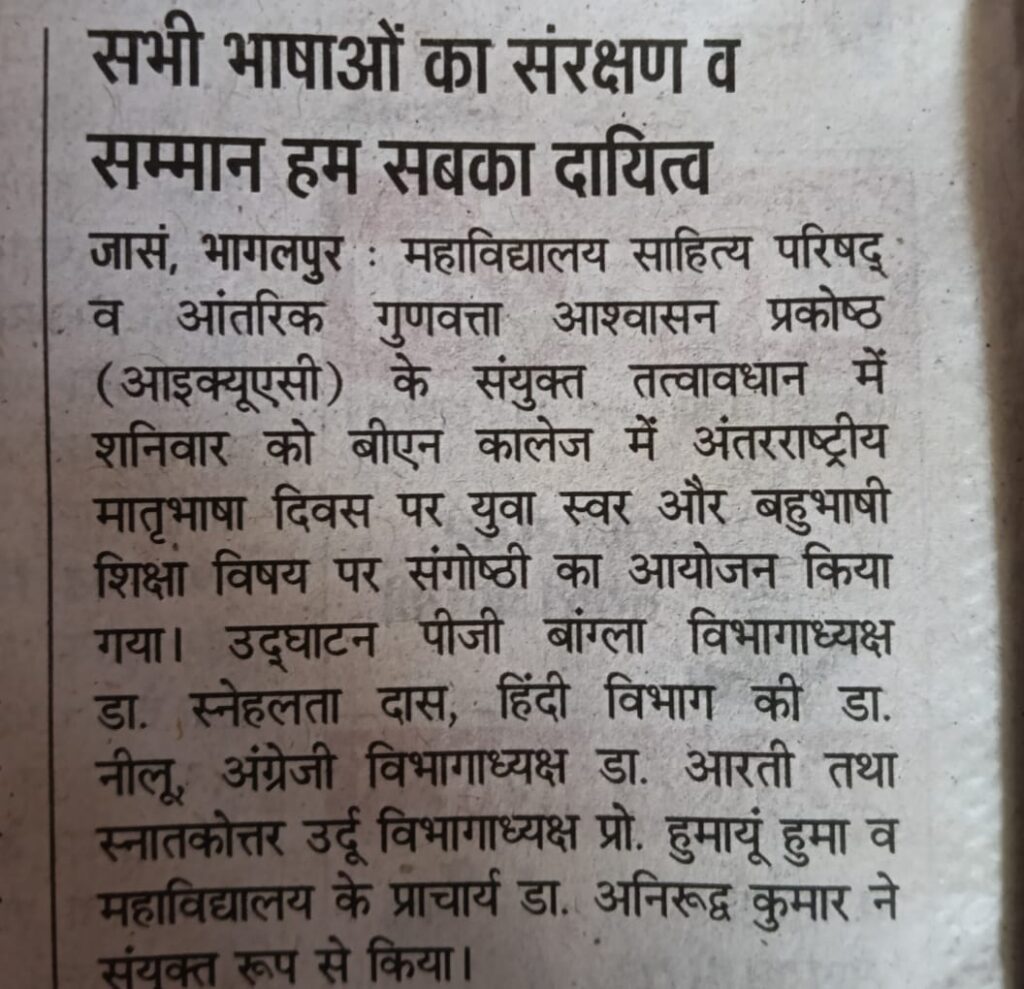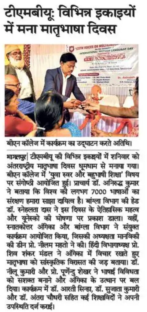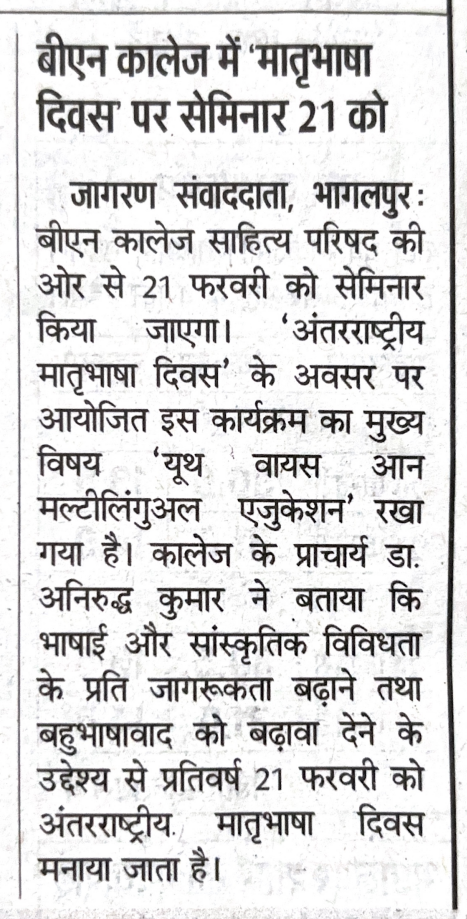महाविद्यालय के प्राचार्य डॉ. अनिरुद्ध कुमार ने अपने अध्यक्षीय उद्बोधन में कहा कि भारत में लगभग 1600 तथा विश्व में करीब 7000 भाषाएँ हैं, और सभी भाषाओं का सम्मान एवं संरक्षण हम सबका दायित्व है। उन्होंने विभिन्न भाषाओं के अध्ययन एवं सांस्कृतिक विरासत के प्रति गर्व की भावना विकसित करने का आह्वान किया।