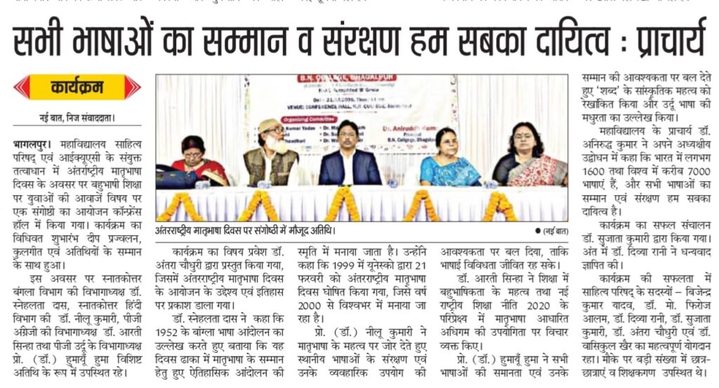 प्रो. (डॉ.) नीलू कुमारी ने मातृभाषा के महत्व पर जोर देते हुए स्थानीय भाषाओं के संरक्षण एवं उनके व्यवहारिक उपयोग की आवश्यकता पर बल दिया, ताकि भाषाई विविधता जीवित रह सके।