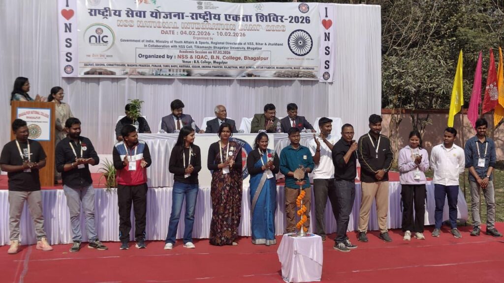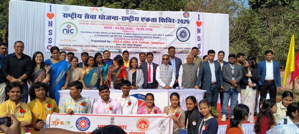 राष्ट्रीय सेवा योजना (एनएसएस) के द्वारा आयोजित राष्ट्रीय एकता शिविर–2026 के अंतर्गत दिनांक 07 फरवरी 2026 को बी. एन. कॉलेज, भागलपुर में एनएसएस तथा आई. क्यू. ए. सी. के संयुक्त तत्वावधान में एकदिवसीय अकादमिक सत्र का भव्य आयोजन किया गया। इस अवसर पर महाविद्यालय परिसर में देश के 15 राज्यों से आए 210 एनएसएस स्वयंसेवक एवं दलनायक उपस्थित रहे। कार्यक्रम में तिलकामांझी भागलपुर विश्वविद्यालय के पूर्व कुलपति प्रो. क्षमेंद्र कुमार सिंह, राष्ट्रीय सेवा योजना के क्षेत्रीय निदेशक (पटना) श्री विनय कुमार, विश्वविद्यालय एनएसएस समन्वयक डॉ. राहुल कुमार तथा पीजी इतिहास विभाग के डॉ. रविशंकर चौधरी विशिष्ट अतिथि के रूप में उपस्थित थे। कार्यक्रम का शुभारंभ दीप प्रज्वलन, टी.एम.बी.यू. कुलगीत एवं एनएसएस गीत के साथ हुआ। तत्पश्चात महाविद्यालय के प्राचार्य तथा ति. मां. भा.वि.वि. के पूर्व कार्यक्रम समन्वयक डॉ. अनिरुद्ध कुमार ने अपने संबोधन में भागलपुर नेशनल कॉलेज की ऐतिहासिक पृष्ठभूमि पर प्रकाश डालते हुए कई सारी उपलब्धियों को देश के विभिन्न राज्यों से आयी टीम के समक्ष रखा, उन्होंने इस अवसर को अपने महाविद्यालय परिवार के लिए एक भावुक और अविस्मरणीय क्षण बतलाया और कहा कि NSS नेशनल इंटीग्रेशन कैंप का मकसद अलग-अलग बैकग्राउंड के युवाओं में एकता, ईमानदारी और राष्ट्रवाद को बढ़ावा देना है। यह देश भर के NSS वॉलंटियर्स को एक साथ लाता है ताकि एकता, आपसी समझ और अलग-अलग कल्चर, परंपराओं और मूल्यों के लिए सम्मान की भावना को बढ़ावा दिया जा सकेउन्होंने कहा कि यह शिविर नेशनल इंटीग्रेशन और विविधता में एकता को बढ़ावा देता है और युवाओं में इमोशनल जुड़ाव बढ़ाता है साथ हीं साथ कल्चरल लेन-देन और समझ तथा सामाजिक ज़िम्मेदारी और कम्युनिटी सर्विस की भावना को बढ़ावा देता है lअपने संबोधन में पूर्व कुलपति प्रो. क्षमेंद्र कुमार सिंह ने बिहार एवं भागलपुर क्षेत्र की सांस्कृतिक विरासत, खान–पान तथा ऐतिहासिक पृष्ठभूमि से देशभर से आए स्वयंसेवकों को अवगत कराया और कहा कि इस प्रकार के आयोजनों से विश्वविद्यालय एवं महाविद्यालय की प्रतिष्ठा राष्ट्रीय स्तर पर और अधिक सुदृढ़ होगी।