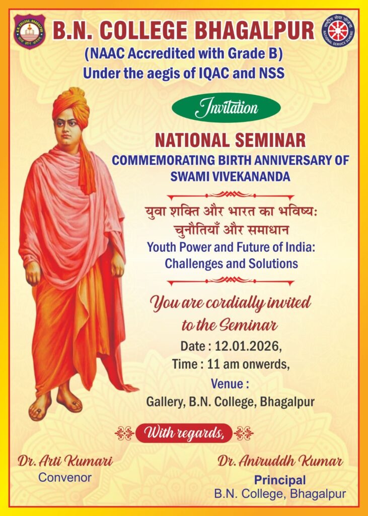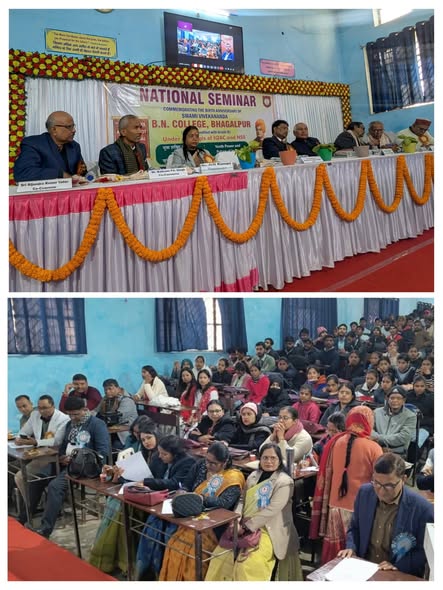 बी.एन. कॉलेज, भागलपुर में 12 जनवरी 2026 को स्वामी विवेकानंद जयंती के अवसर पर एक दिवसीय राष्ट्रीय संगोष्ठी का आयोजन किया गया। कार्यक्रम का विधिवत शुभारंभ दीप प्रज्वलन से हुआ, जिसके पश्चात विश्वविद्यालय कुलगीत तथा महाविद्यालय सांस्कृतिक परिषद द्वारा स्वागत गान प्रस्तुत किया गया। सभी गणमान्य अतिथियों द्वारा स्वामी विवेकानंद की प्रतिमा पर पुष्पांजलि एवं माल्यार्पण किया गया।स्वागत संबोधन में प्रधानाचार्य एवं कार्यक्रम संरक्षक डॉ. अनिरुद्ध कुमार ने अतिथियों का स्वागत करते हुए कहा कि भारत विश्व का सबसे युवा जनसंख्या वाला देश है और युवाओं को अनुशासन, धैर्य एवं सकारात्मक दृष्टिकोण के साथ राष्ट्र निर्माण में अग्रसर होना चाहिए। कार्यक्रम संयोजिका डॉ. आरती कुमारी ने विषय-प्रवेश कराते हुए युवाओं को स्वामी विवेकानंद के आदर्शों पर चलने का संदेश दिया।